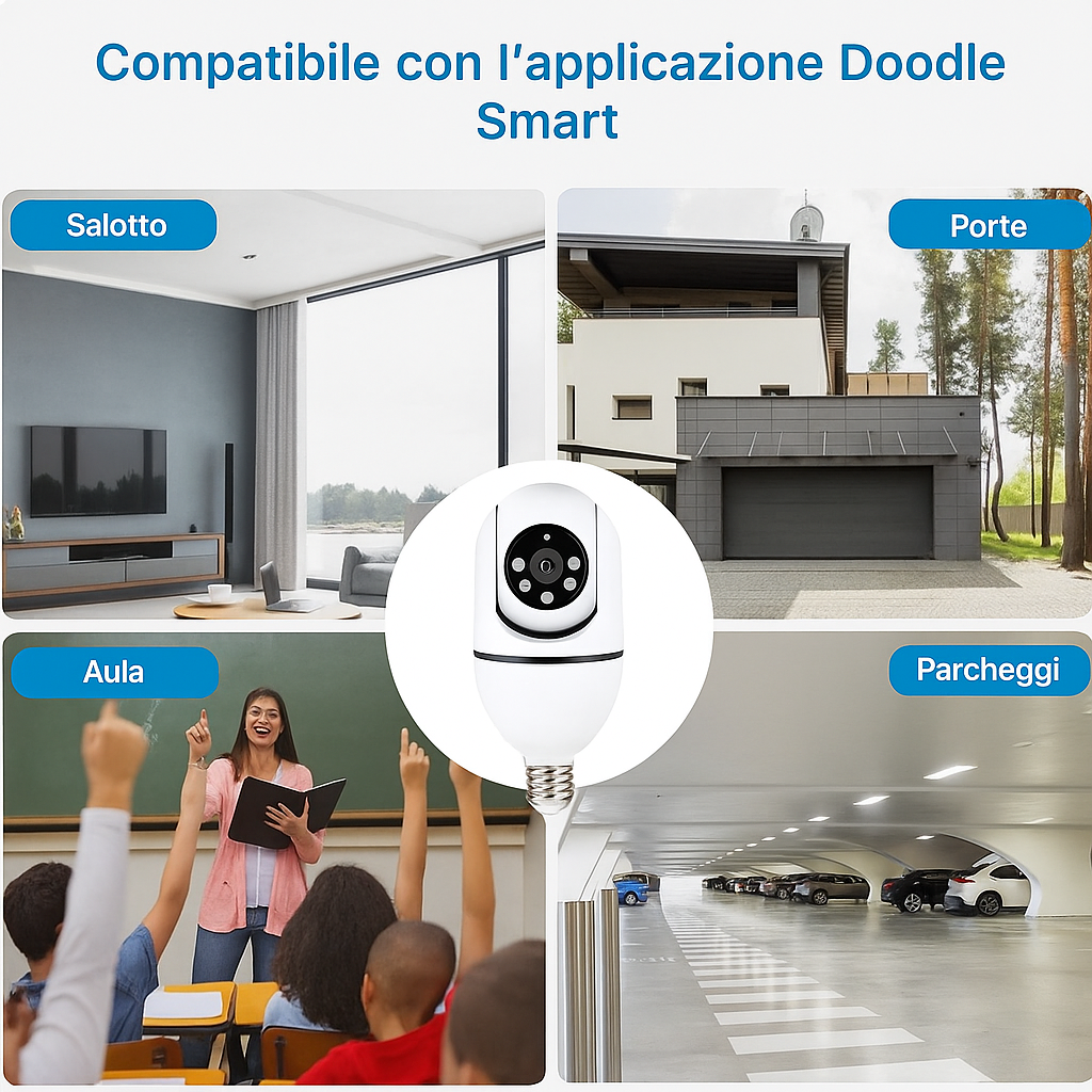 La telecamera funziona con l’app Doodle Smart (come indicato nell’immagine). Permette di controllare la telecamera, regolare l’angolo, vedere in diretta e ricevere notifiche.